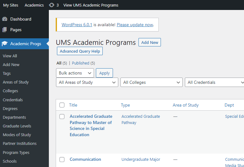 From the Dashboard of the Academics site, select “Academic Progs” to open the Programs post type.