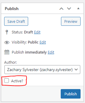- Before you publish, be sure to check the “Active?” box. If this is not checked, the alert will not display.